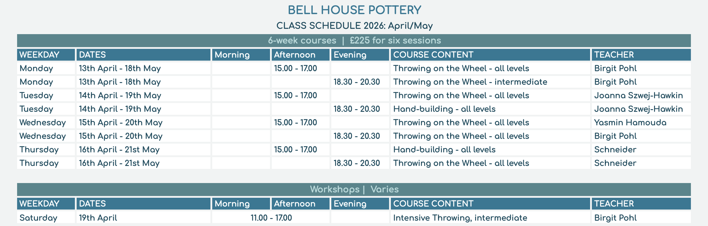 Upcoming Pottery Workshops